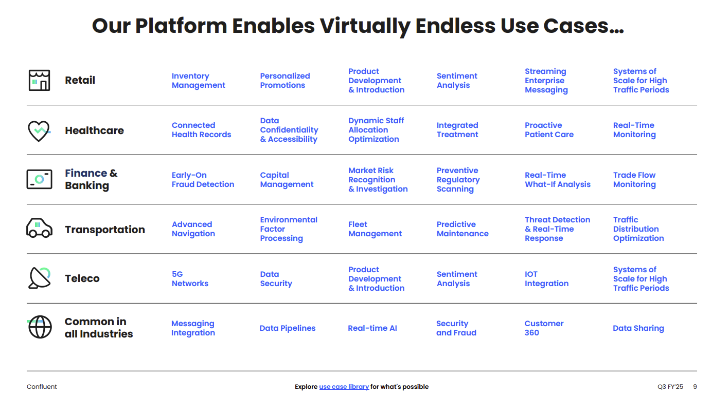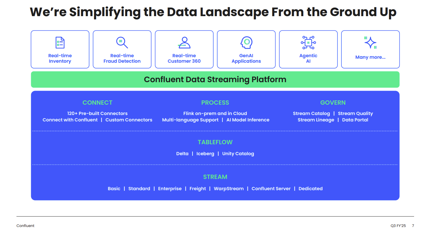 - Real-time data streaming via a "broad platform where all the parts work together" including connectivity, governance and real-time processing with Confluent's Flink compute offering.