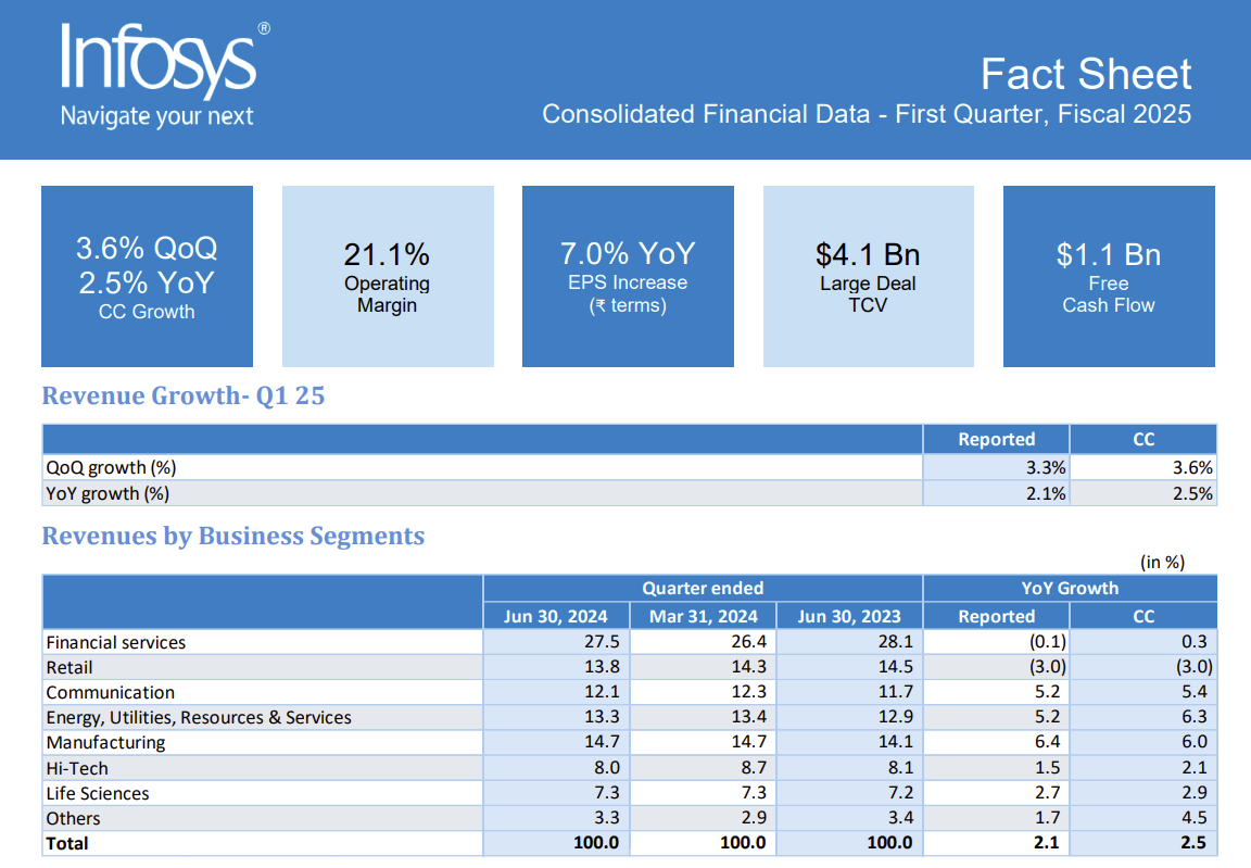 Infosys reported fiscal first quarter revenue of $4.71 billion with net income of $764 million. Persistent reported first quarter revenue of $328.2 million, up 16% from a year ago.