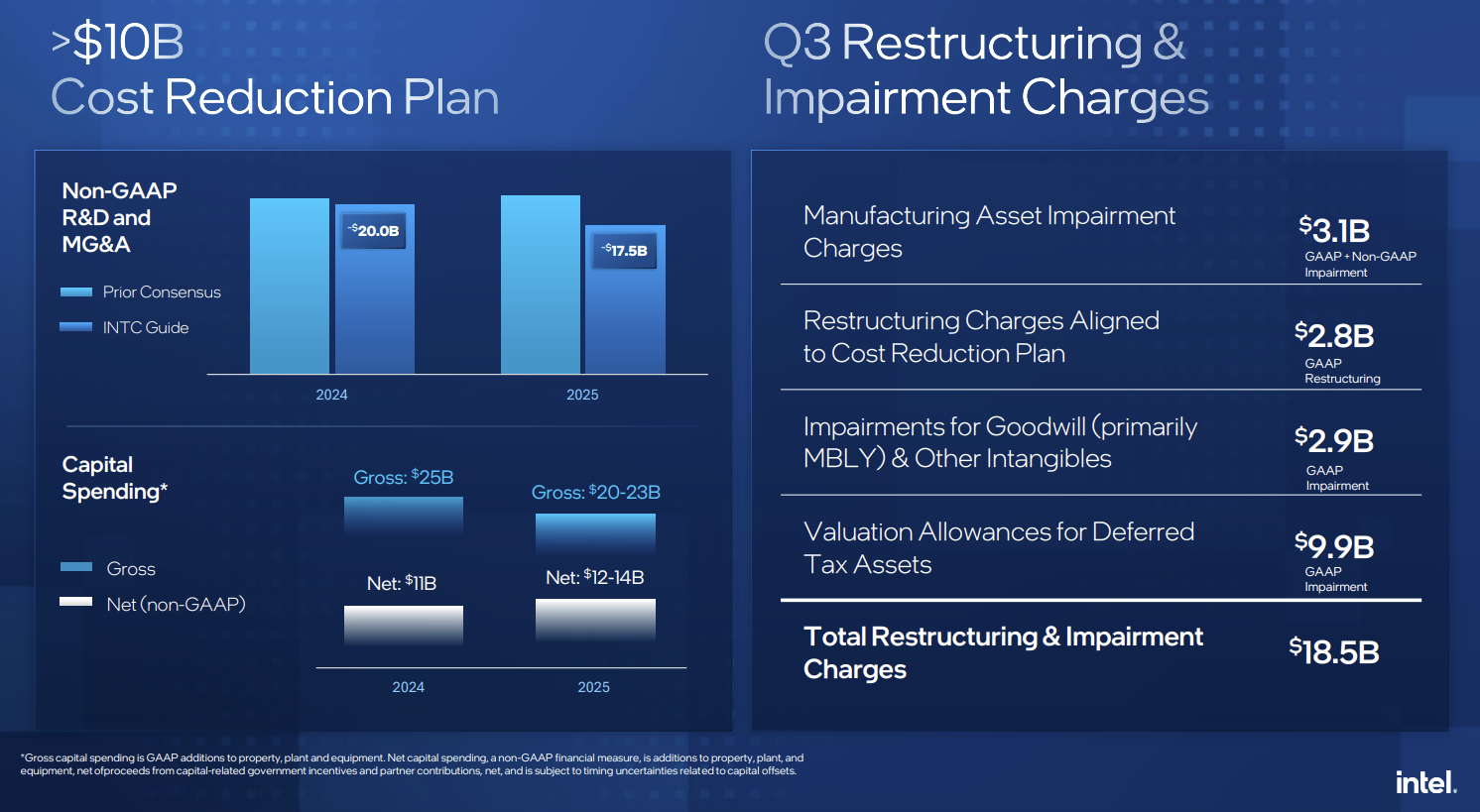 - Intel reported a third quarter net loss of $16.6 billion, which includes restructuring charges on revenue of $13.3 billion, down 6% from a year ago. On a non-GAAP basis, Intel lost $2 billion, or 46 cents a share.