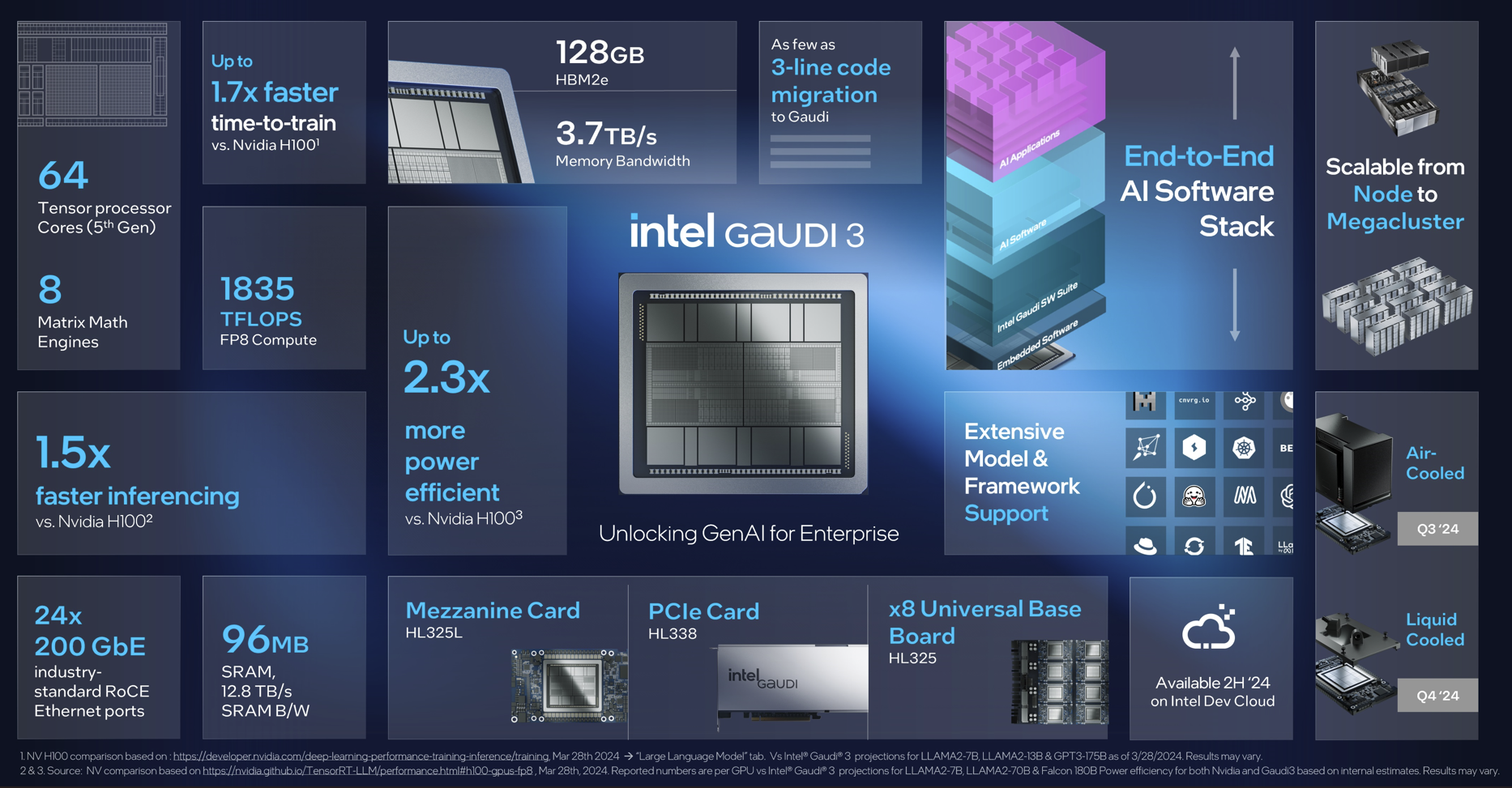 According to Intel, Gaudi 3 has 50% average better inference and 40% better average power efficiency than Nvidia H100 with lower costs. It's worth noting that the Nvidia has outlined its Blackwell GPUs and accelerators that leapfrog H100 performance.