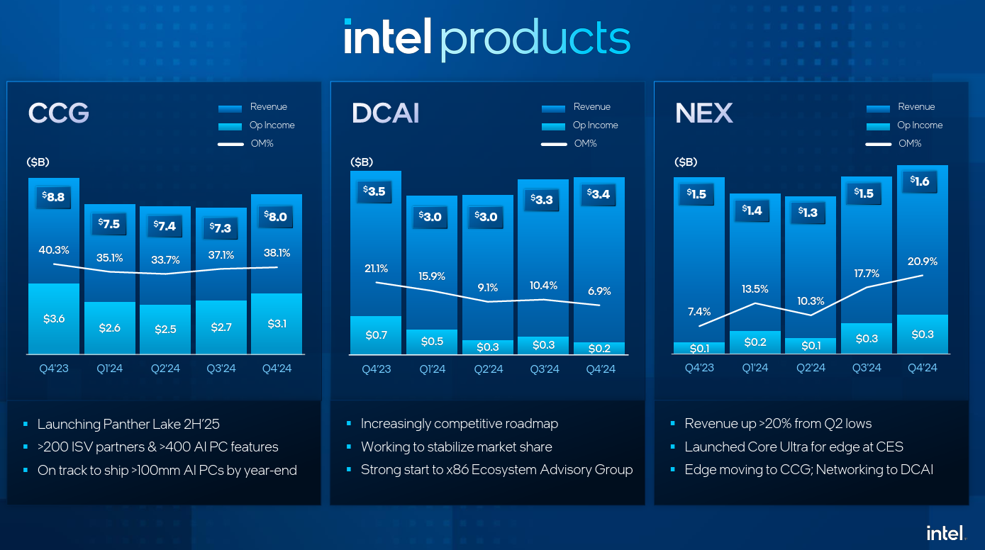 - Intel's Client Computing Group fourth quarter revenue was $8 billion, down 9% from a year ago. Intel said it is on track to ship more than 100 million AI PCs by the end of 2025.