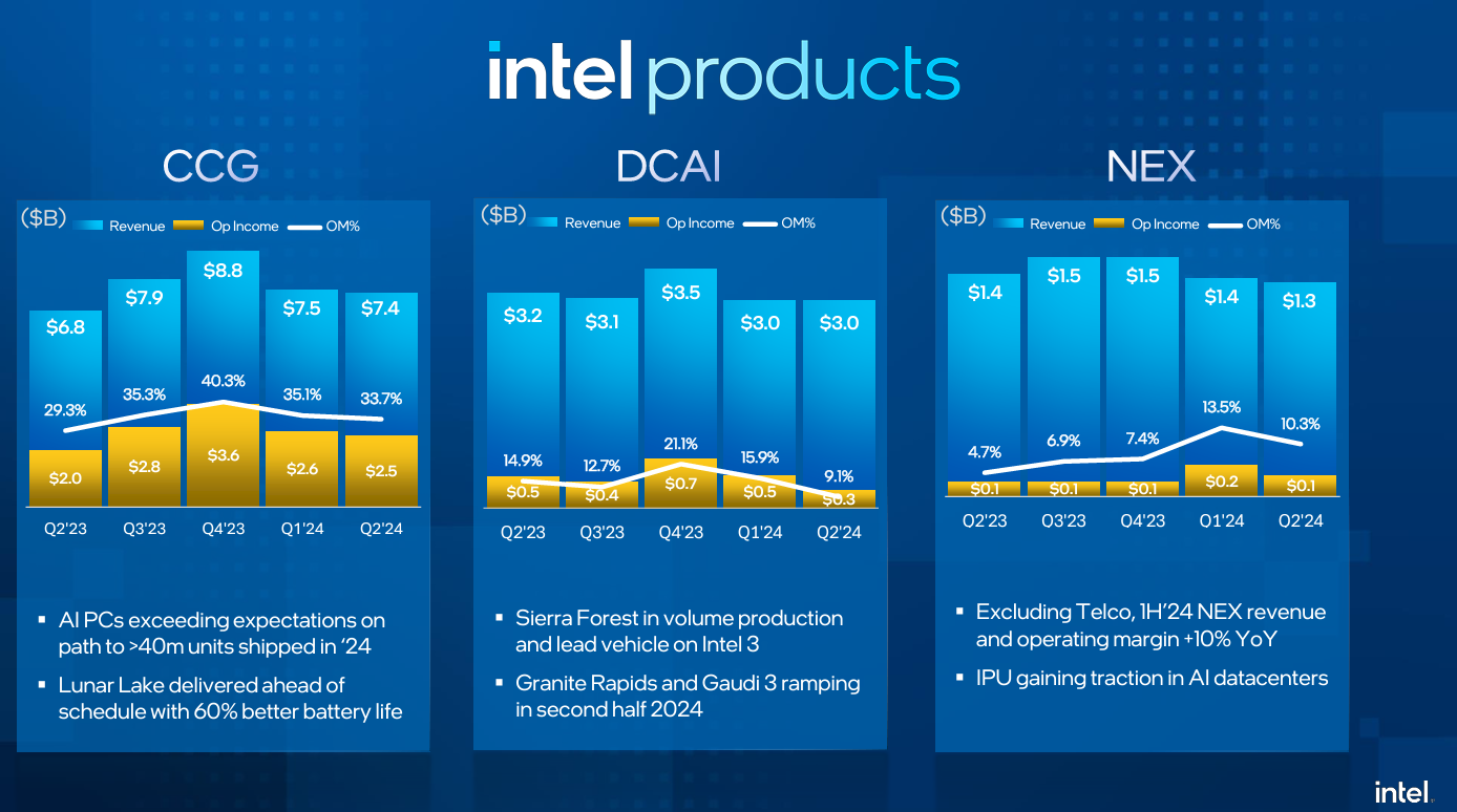 Intel, which is getting squeezed by both Nvidia and AMD, reported a second quarter net loss of 38 cents a share on revenue of $12.8 billion, down 1% from a year ago. Non-GAAP earnings in the second quarter were 2 cents a share.