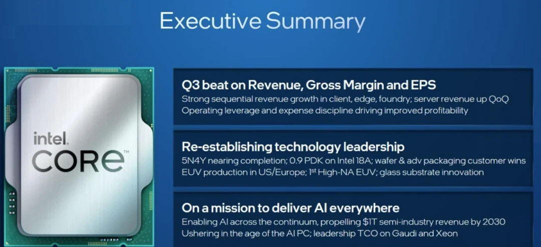 CEO Pat Gelsinger said the company delivered "across-the-board progress" and is moving forward with its foundry business. By the numbers:
