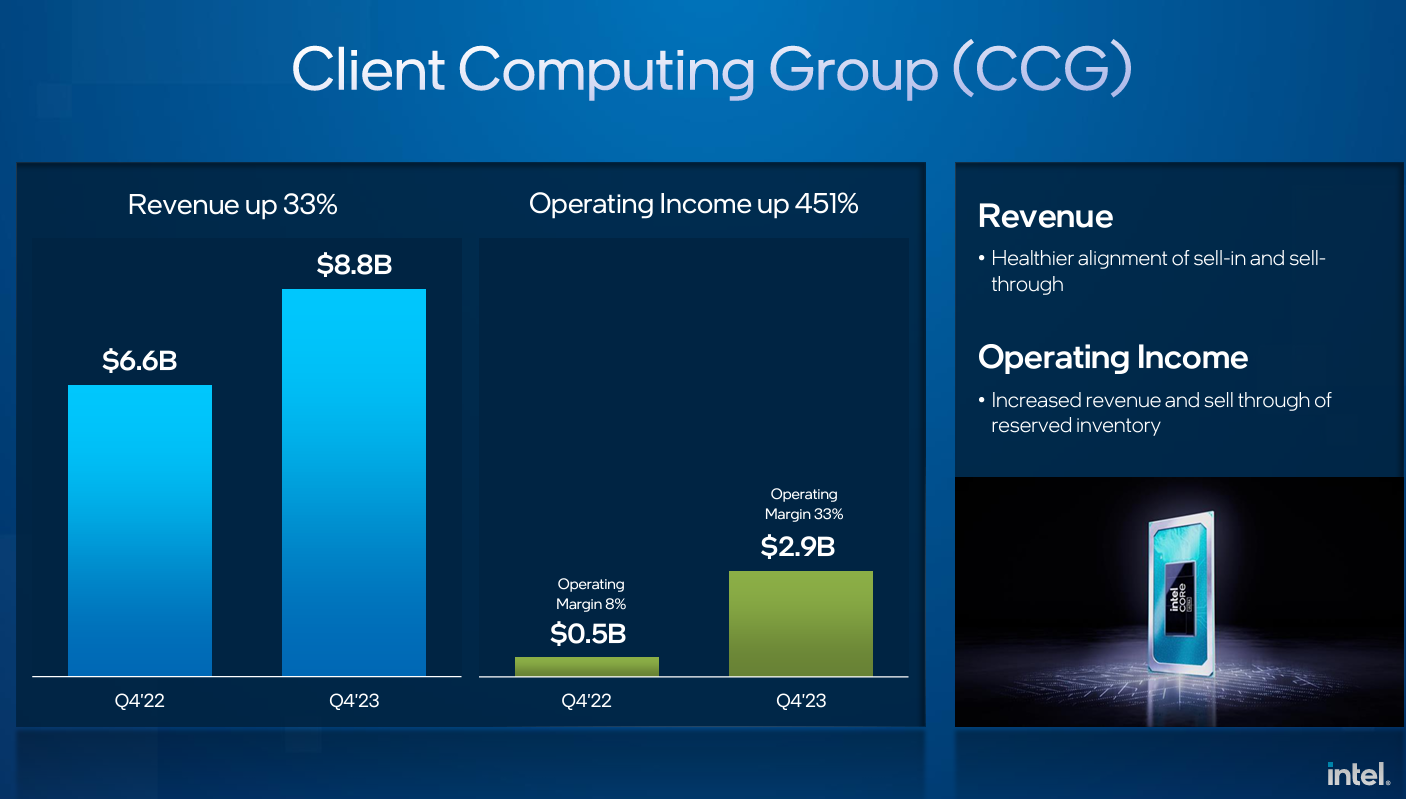 By unit, Intel's fourth quarter was driven by the client computing group, which had revenue of $8.8 billion, up 33% from a year ago. For 2023, however, the client computing unit saw sales fall 8%. Intel saw its PC unit rebound in the third quarter.