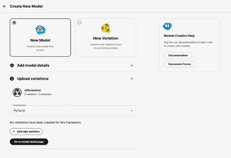 Users will have to document the model variations including framework, model weights and license as well as document them. Models can be private to the user or made public.