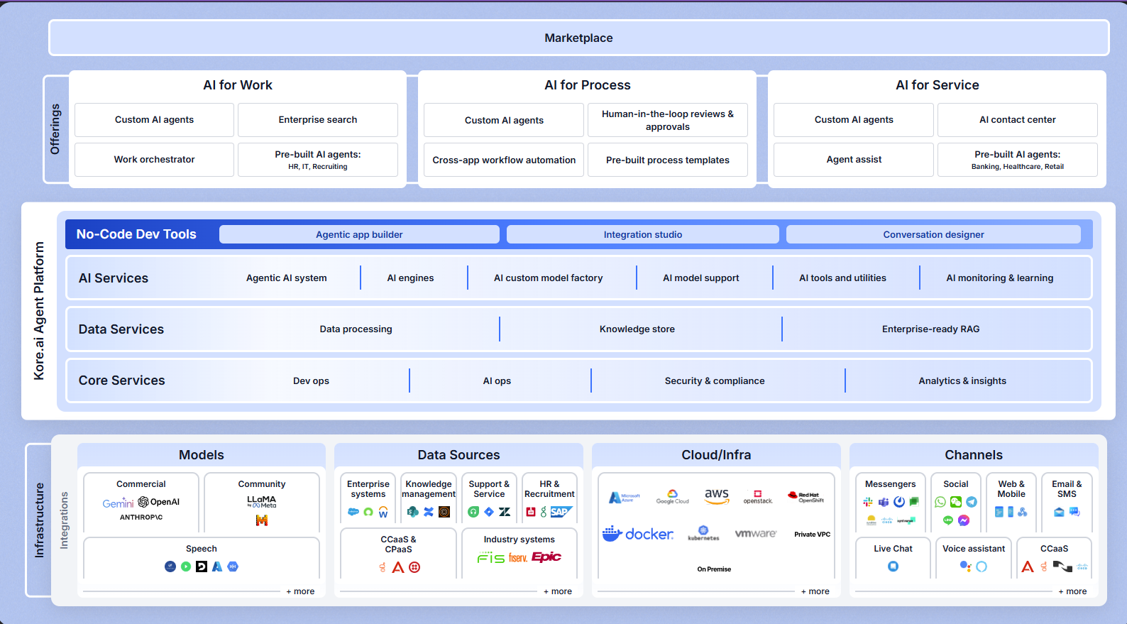 AI Agents Marketplace with pre-built templates for agents and connectors. Kore.ai is focusing on industry templates for banking, healthcare, retail, HR, IT and recruiting.