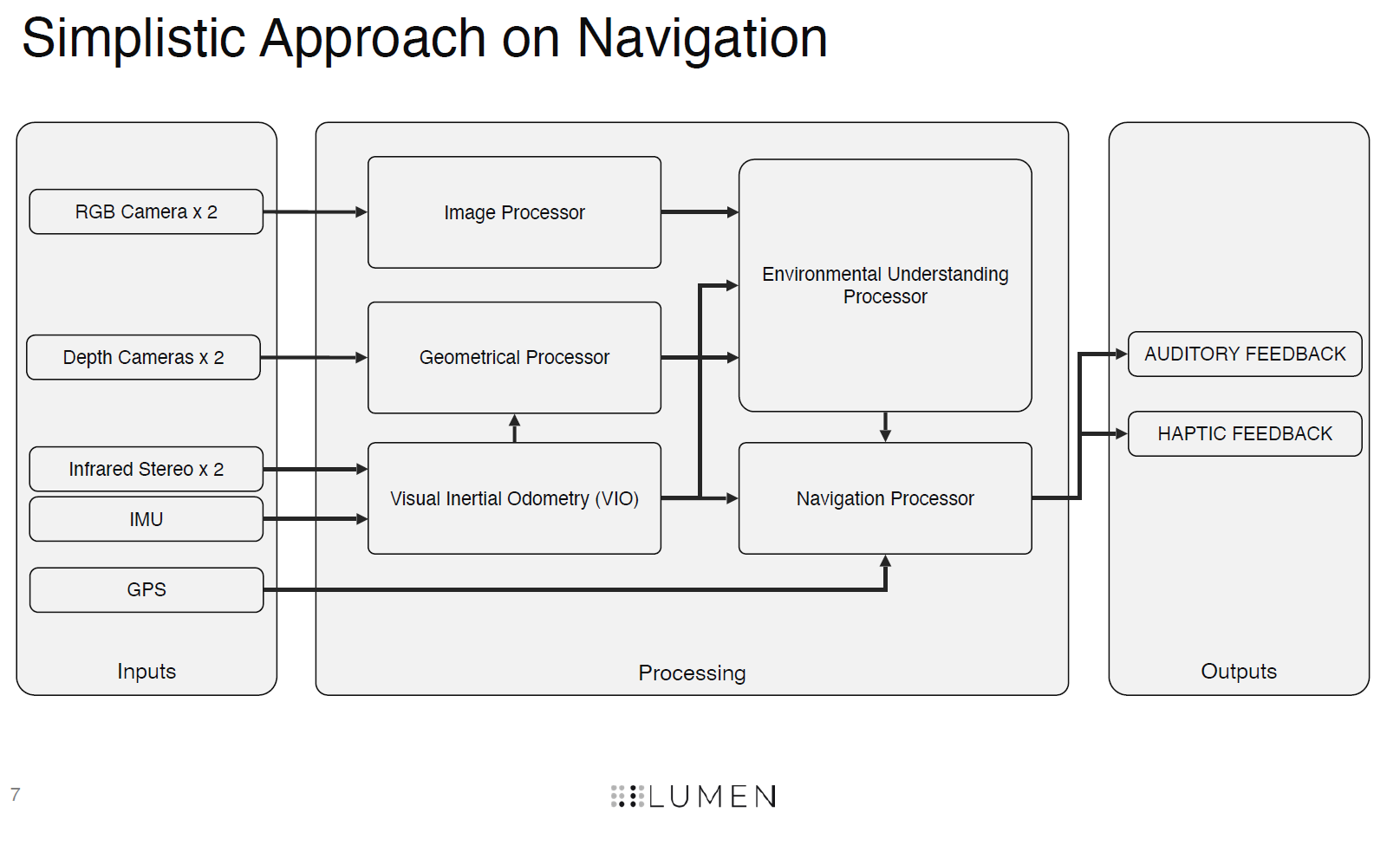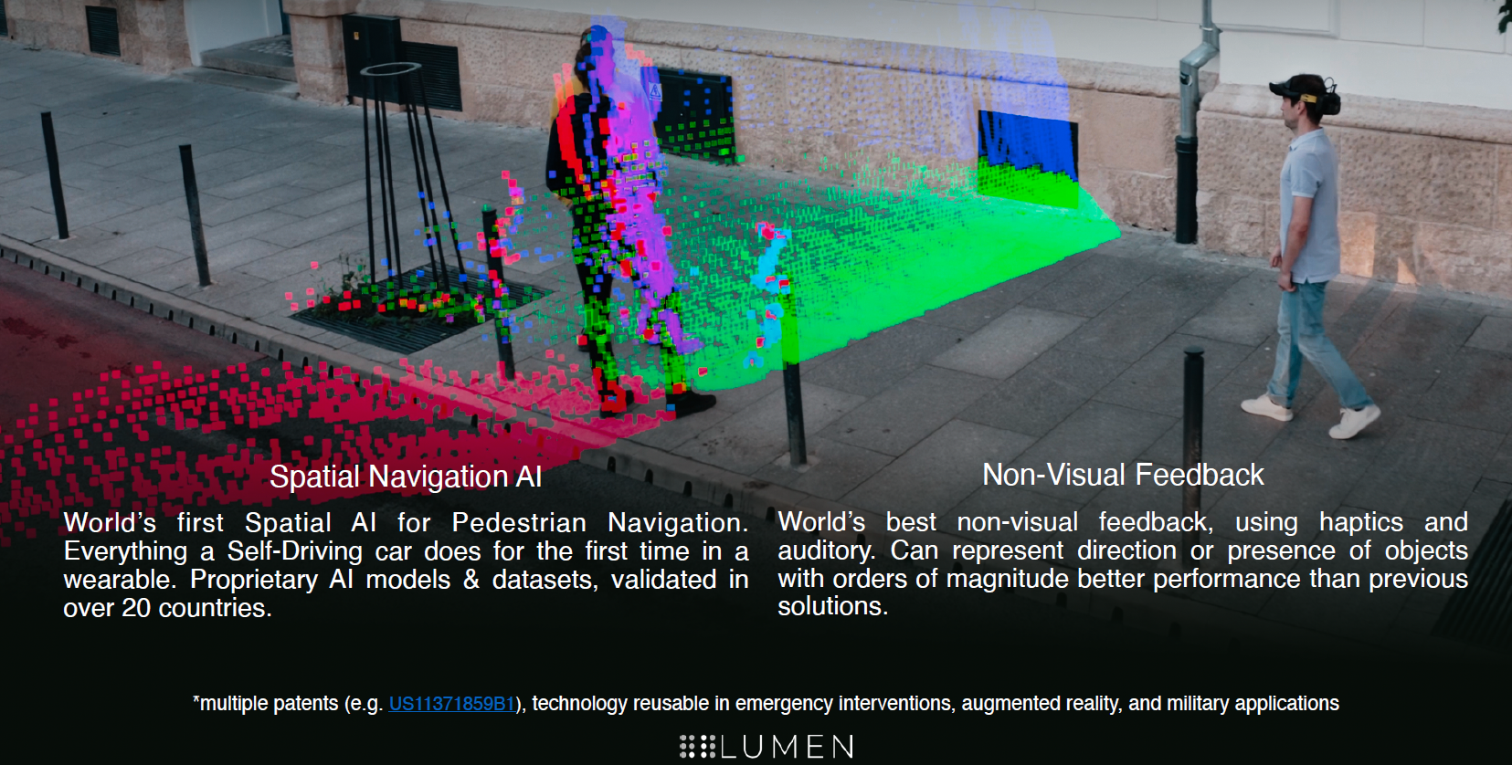 Amariei explained how .Lumen's headset includes spatial navigation AI to understand the pedestrian world the same way a self-driving car would. The headset also includes a non-visual feedback interface that uses haptics to guide the blind.