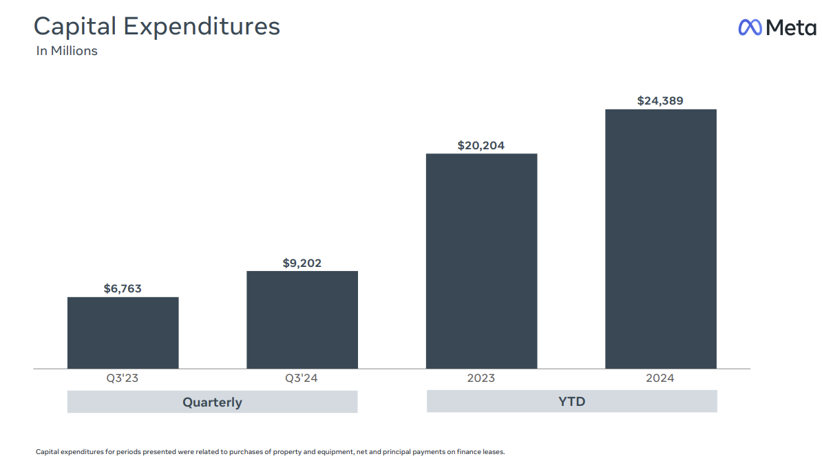 Specifically, Meta projected 2024 capital expenditures to be $38 billion to $40 billion, updated from the $37 billion to $40 billion range. The company now expects "a significant acceleration in infrastructure expense growth next year."