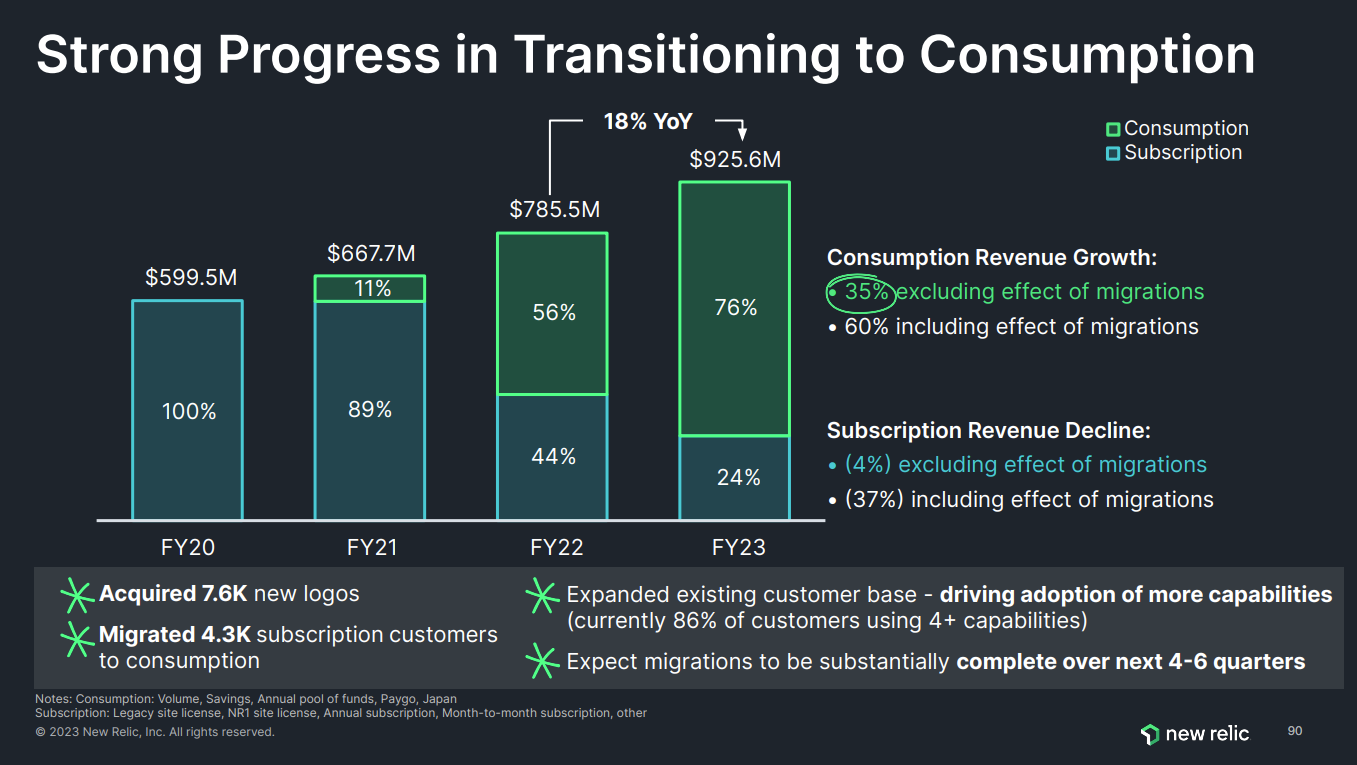 The transition from a subscription-based ELA model to a consumption-based model is almost complete and NewRelic is surprisingly able to hold the pricing power. The company had 18% YoY growth with about 76% of the customers converted to the consumption-based pricing model. However, some of the customers have complained about the higher cost of observability for the New Relic solution in the consumption-based model and the sticker shock of prices at the end of the year.