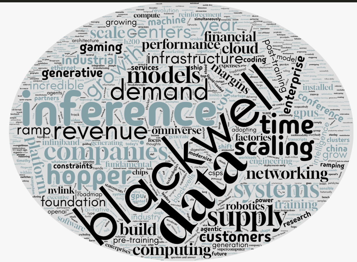 I ran the Nvidia transcript on OpenAI to assess sentiment and the result was "overwhelmingly positive." The word cloud looked like this.