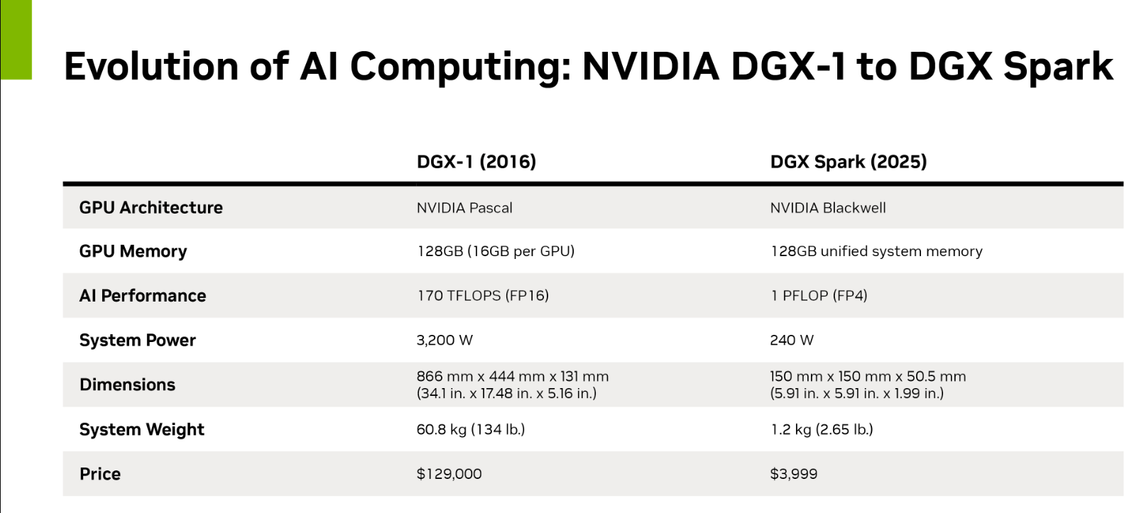 - DGX Spark has more power than Nvidia's 2016 DGX-1 system from 2016 with a much lower price and power profile.