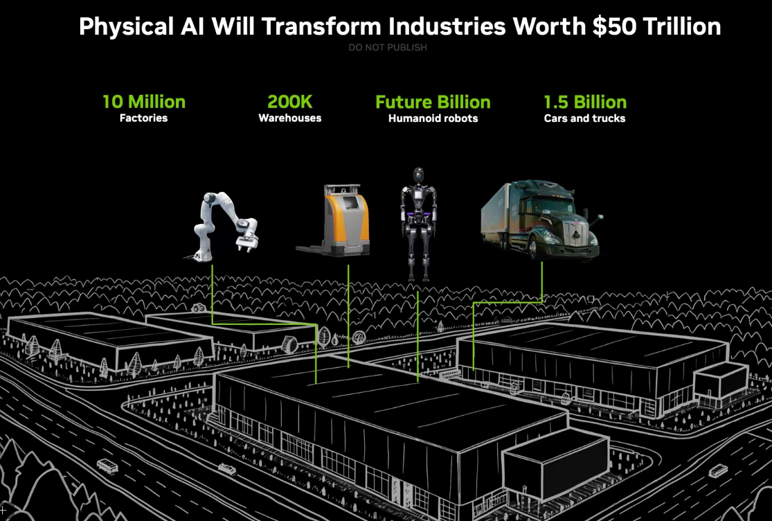 "Physical AI will revolutionize the $50 trillion manufacturing and logistics industries. Everything that moves â from cars and trucks to factories and warehouses â will be robotic and embodied by AI."