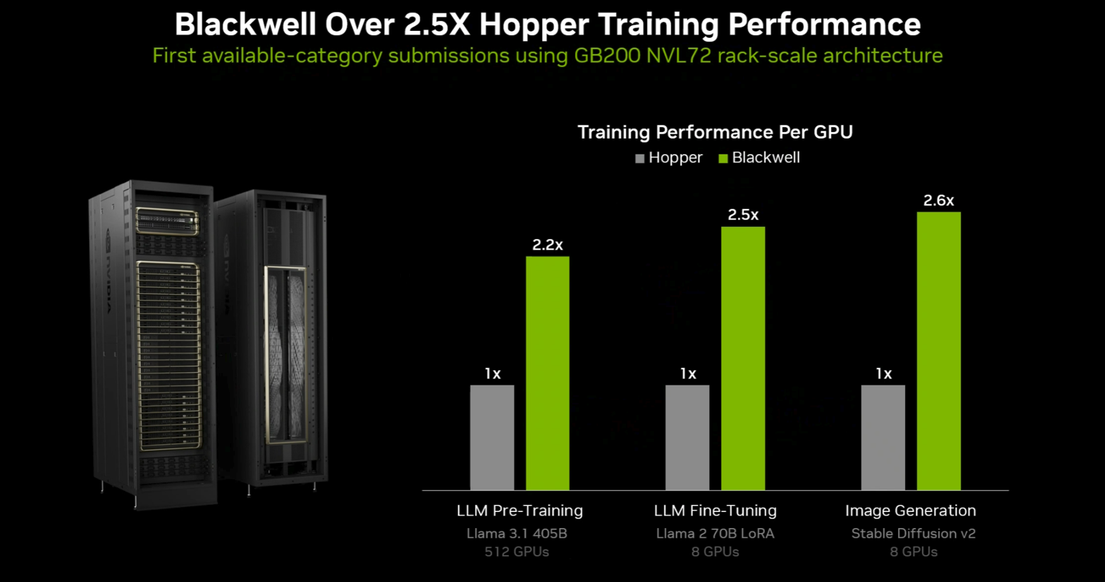 Nvidia said its GB200 NVL72 rack scale systems outperformed Hopper by a wide margin based on MLPerf Training submissions across categories.
