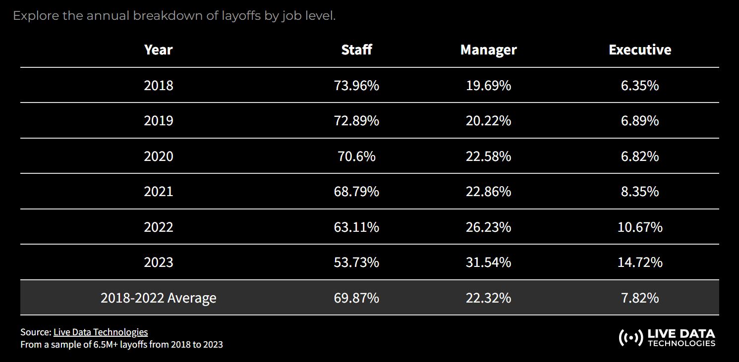 According to Live Data Technologies, manager-level or higher layoffs made up nearly half of all observed layoffs in 2023.