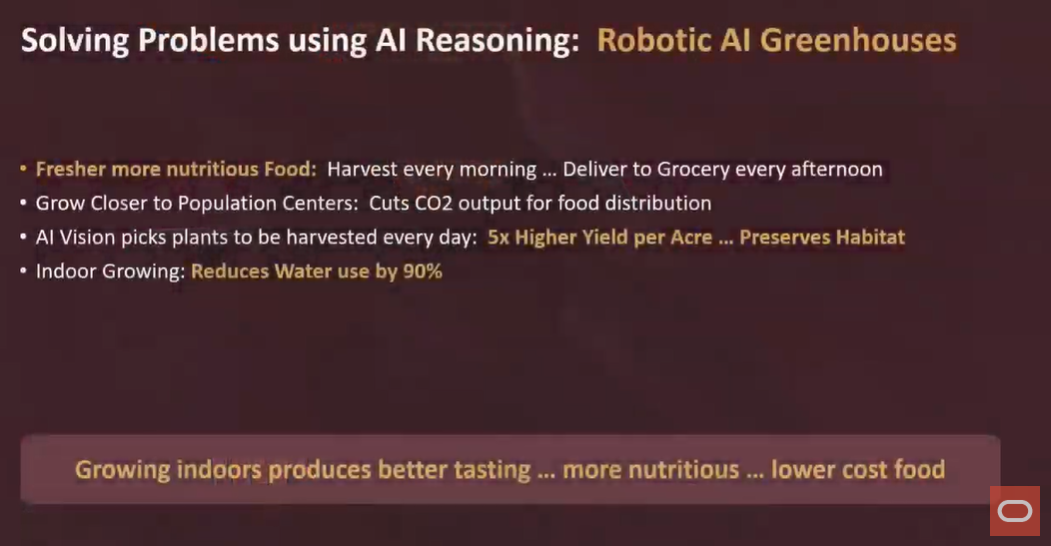 Ellison said there's a need for "robotic greenhouse systems" and AI driven farming. "We need to produce much more fruit and food than we currently do. We're going to run out of water. We're going to run out of arable land. We can't keep taking habitat and converting it to farmland. We have to be much more efficient," said Ellison. "By growing and by growing in greenhouses and moving plants around, plants only need a lot of room for the few weeks before they're harvested."