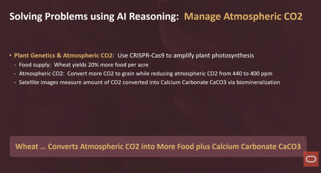 AI-assisted engineering of crops. Ellison said crops can be engineered to remove CO2 from the atmosphere while increasing food production. "We could use our food crops, we could actually increase the food yield while lowering CO2 through a natural process called bio-mineralization," said Ellison. The general idea is to engineer crops to extract nitrogen from the atmosphere via an enzyme called Nitrogenase, naturally found in soybeans.