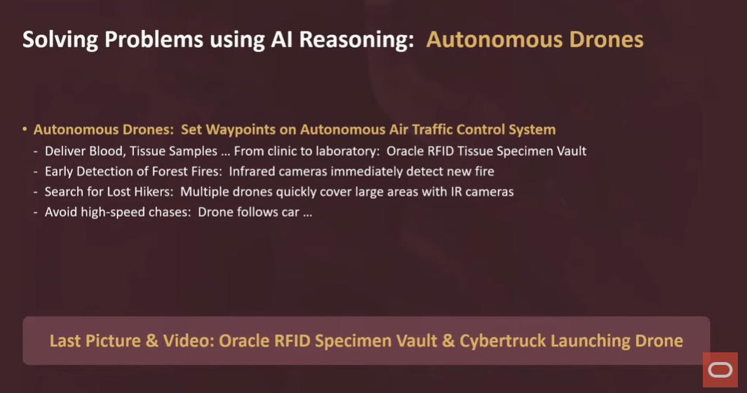 Forest fire detection and response. Ellison demonstrated autonomous drones equipped with infrared cameras that can "detect forest fires immediately" and even determine if fires were deliberately set.