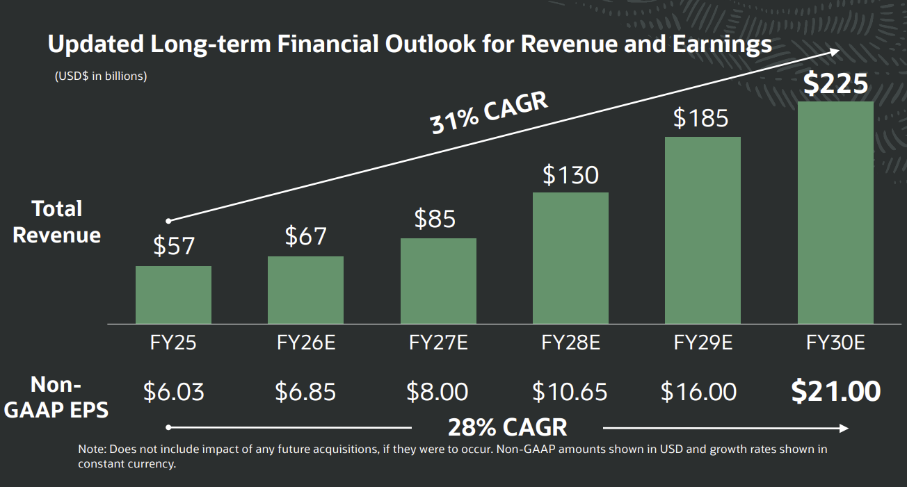 Oracle is aiming to automate multiple industry ecosystems. The company is projecting fiscal 2030 revenue of $225 billion with a compound annual growth rate of more than 31% over the next five years. For earnings, Oracle is targeting $21 cents a share in annual earnings by fiscal 2030.