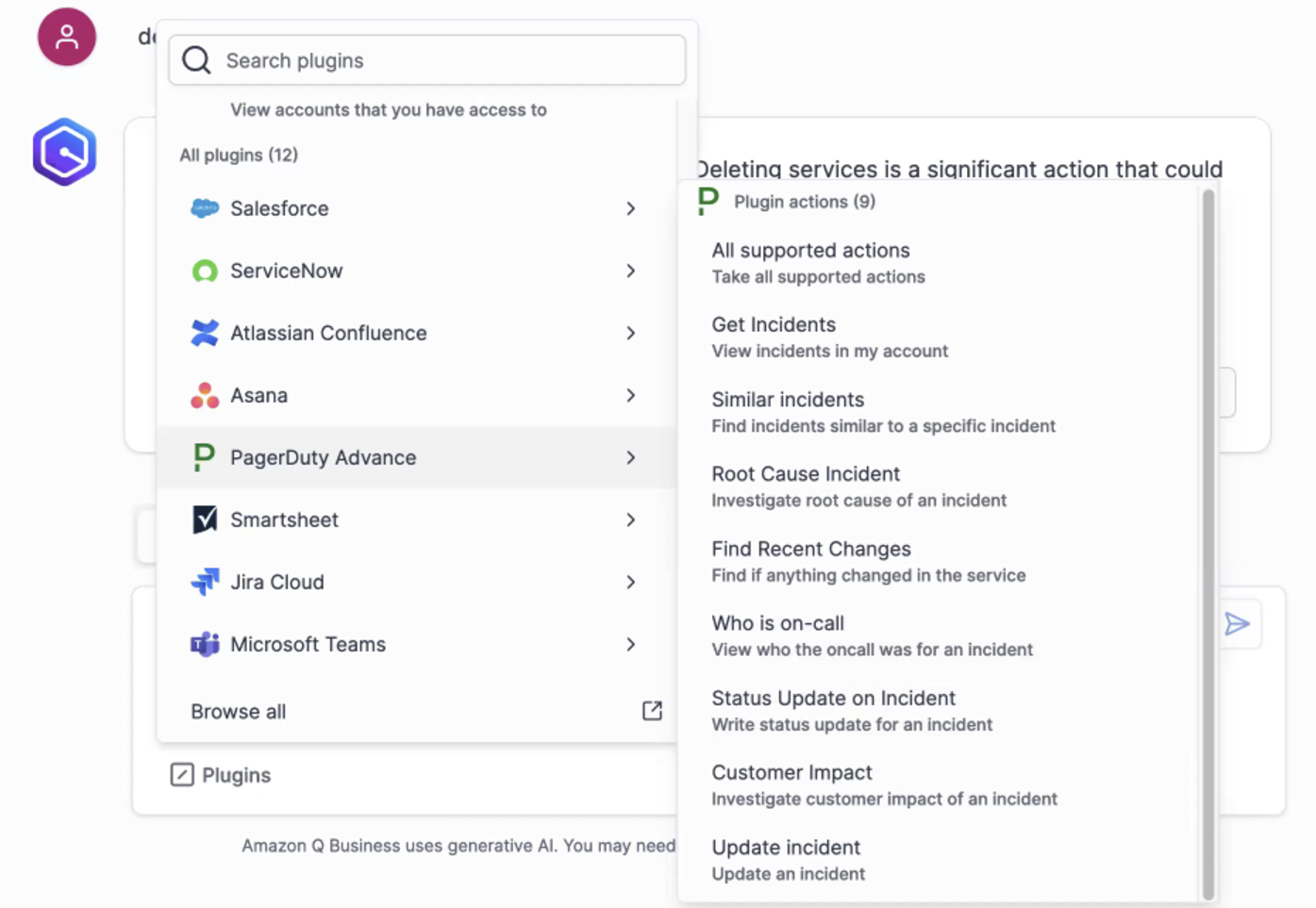 - In Amazon Q Business, PagerDuty is the first incident management platform to integrate. PagerDuty Advance customers will use one interface via Amazon Q Business plugins. PagerDuty said that early adopters said they saved an average of 30 minutes per incident with the integration.
