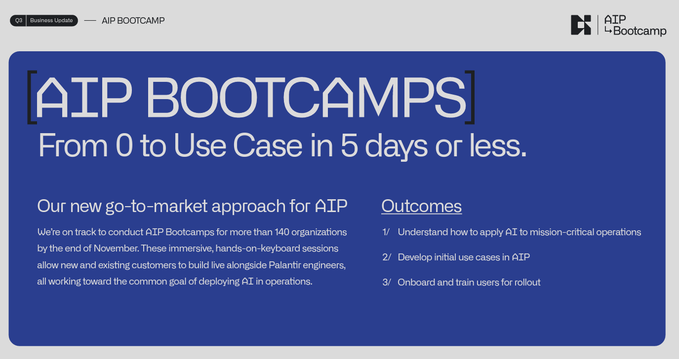 Palantir has seen traction with "AIP boot camps," which deliver real workflows on customer data in 5 days or less. That approach is driving contract expansions. "We're on track to conduct boot camps for more than 140 organizations by the end of November, nearly half of those are taking place this month alone, which is more than the number of U.S. commercial pilots we conducted all of last year," said Taylor. "We almost tripled the number of AIP users last quarter and nearly 300 distinct organizations have used AIP since our launch just five months ago. We will continue investing meaningfully in boot camps as our go-to-market strategy for AIP."