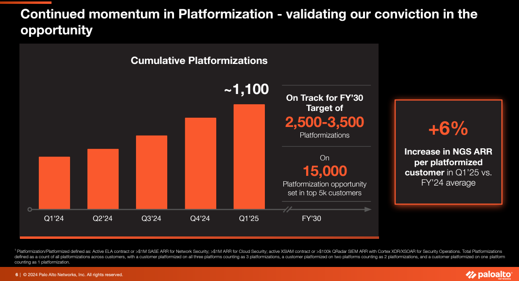 "Palo Alto Networks' Q1 FY25 results reflect their conviction and commitment to platformization, driving 40% YoY growth in NGS ARR. The inclusion of QRadar SaaS contracts, acquired from IBM, contributed to this ARR growth, though the company anticipates transitioning these customers to XSIAM solutions in the coming quarters.