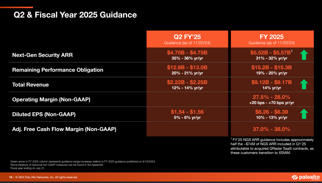 For fiscal 2025, Palo Alto Networks projected revenue of $9.12 billion to $9.17 billion, up 14% from the previous year. Non-GAAP earnings will be between $6.26 a share to $6.39 a share.