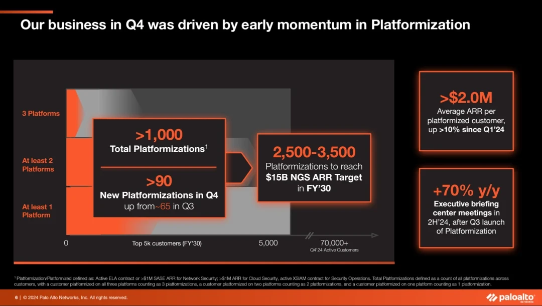 Arora pointed out new customers betting on the Palo Alto Networks platform strategy and noted that it had more than 90 new platformization deals in the fourth quarter, up from 65 in the third quarter. The average ARR for a platformed customer is more than $2 million.