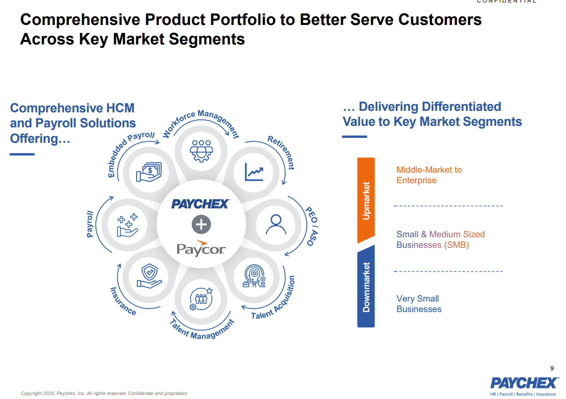 In a presentation, the focus of the deal was go-to-market efforts. Paychex and Paycor expect to win in more customer segments, sell Paycor's workforce management, talent acquisition and talent management tools to Paychex customers. Paychex's HR advisory and employee solutions will be sold to Paycor customers.