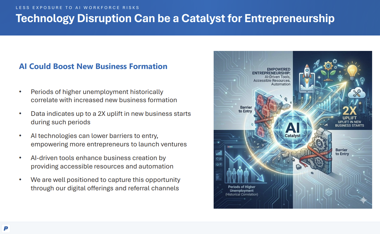 "If AI disrupts large firms disproportionately, talent may shift to smaller businesses, benefiting our clients. Meanwhile, our clients continue to face talent shortages and AI can help improve efficiencies to address those gaps," said Gibson.