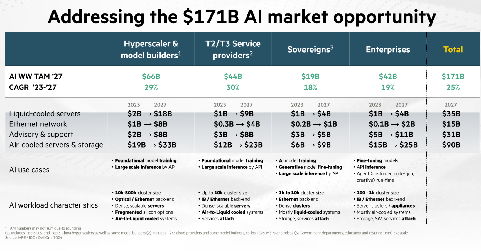 During HPE's AI day, CEO Antonio Neri outlined the company's market segments including hyperscalers and model builders. "The hyperscaler and model builders are training large language AI models on their own infrastructure with the most complex bespoke systems. Service providers are providing the infrastructure for AI model training or fine-tuning to customers so they can place a premium on ease and time to deployment," said Neri.