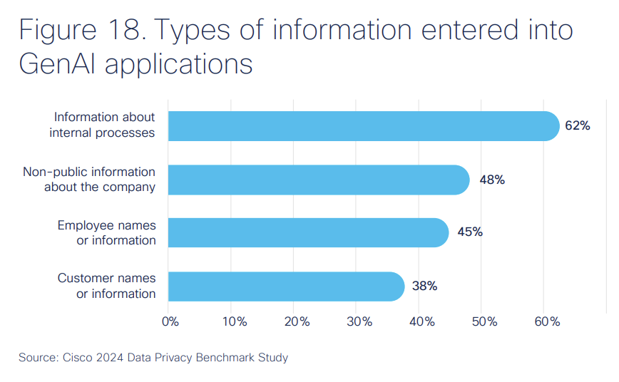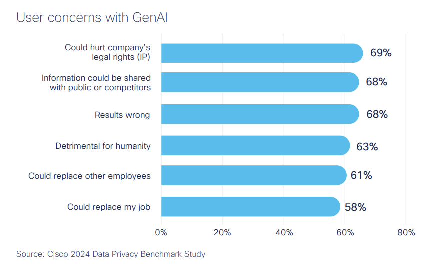The study, the Cisco 2024 Data Privacy Benchmark Study, drills down on generative AI concerns. The study was based on responses from 2,600 privacy and security professionals around the world.