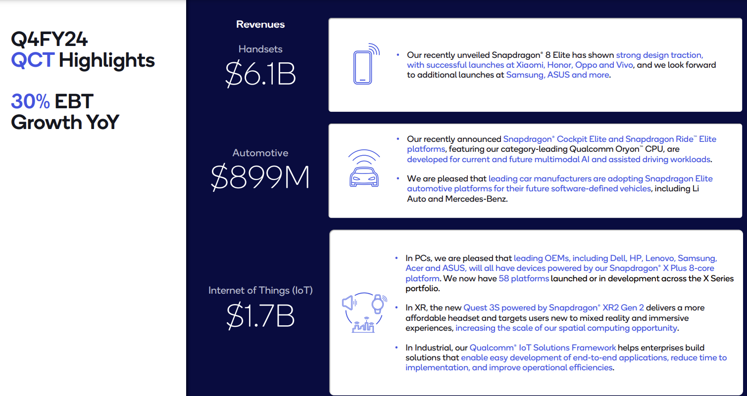 "Qualcomm had a very strong Q4 with all revenue lines growing, The growth in automotive is particularly encouraging, a market that has been traditionally slower for Qualcomm, but showed 68% growth. Qualcomm almost doubled its EPS. Cristiano Amon and team remain optimistic with an realistic but optimistic growth for the next fiscal year. All eyes will be on the performance and uptake of the new Snapdragon Elite platform."