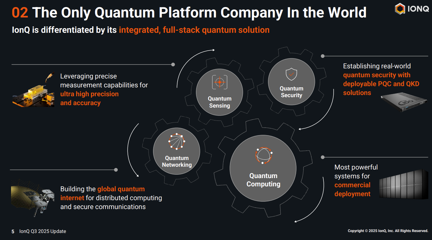 "IonQ has a truly unique ability to land and expand quantum computing, quantum networking, quantum sensing and quantum cybersecurity. Our strategy is to expand our technical lead in each quantum product family and connect our products together to provide unique solutions to allied sovereigns and major multinationals alike," said de Masi, who noted IonQ has more than 1,100 patents pending and granted.