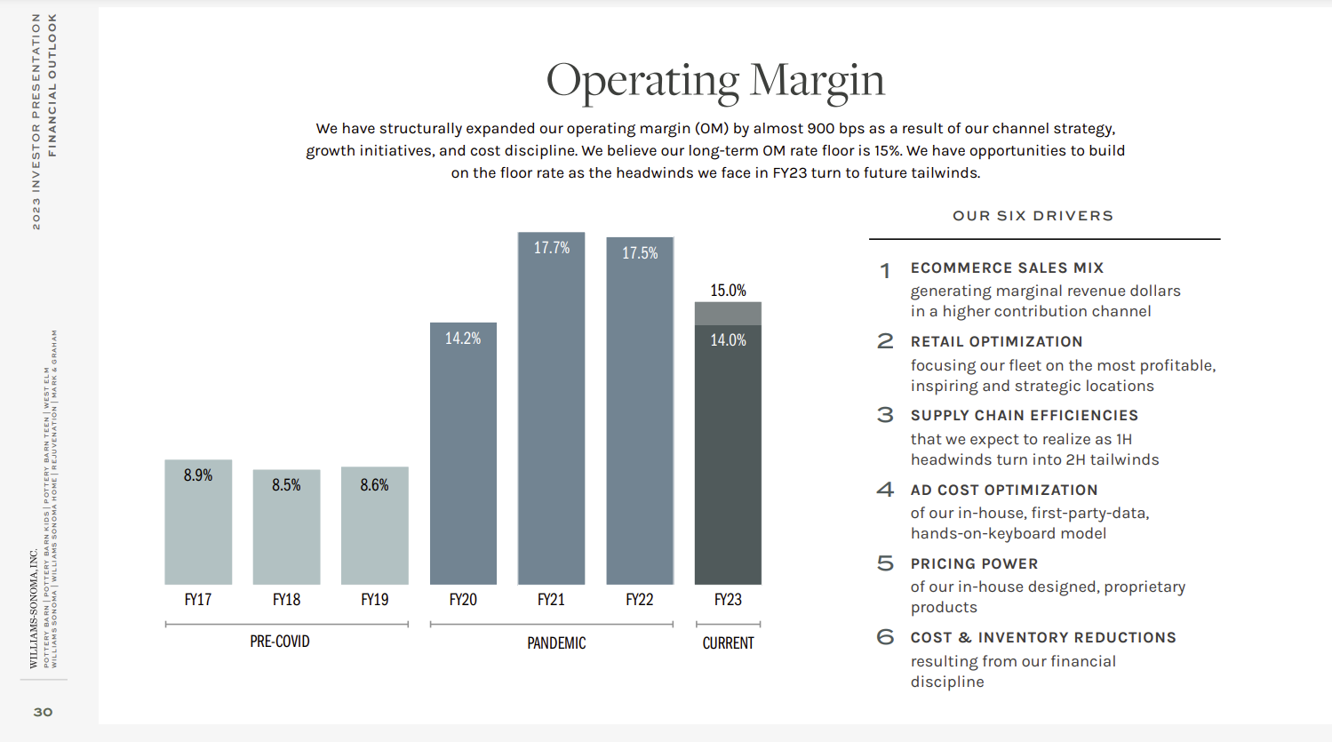 - Customer service improvements. Alber noted that Williams Sonoma's customer service metrics have returned to pre-pandemic levels as have on-time deliveries.