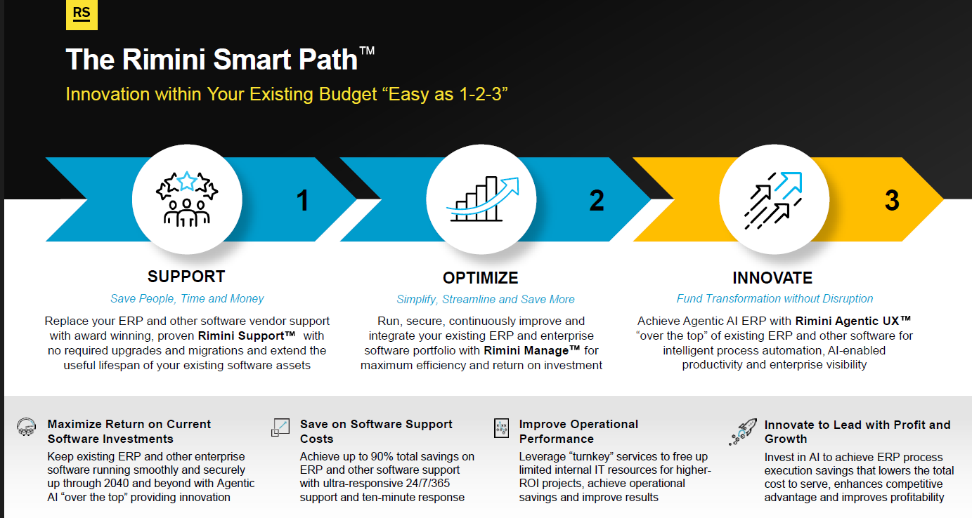 Rimini Street's portfolio includes methodology called Smart Path, which revolves around a gradual move to a process-driven system and out of the ERP software game.