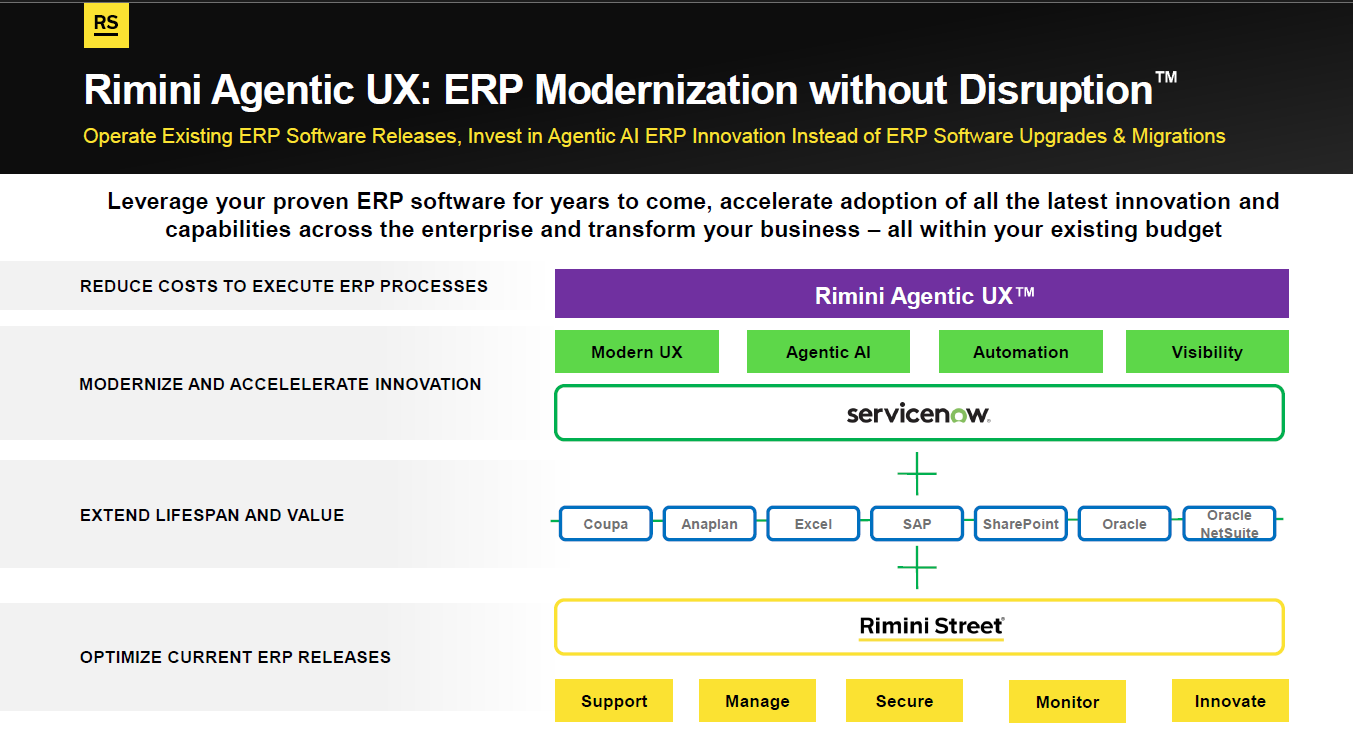 Rimini Street's second act, which will run from 2026 to 2030, includes an AI spin to its traditional ERP services. The company plans to maintain ERP systems, give customers the ability to put off costly upgrades and relegate them to systems of record plumbing. The new UI for these legacy systems will be agentic AI. The company launched Rimini Street Agentic UX, which has been deployed across multiple customers, in a move that aims to abstract away ERP systems by focusing on AI workflows and processes.
