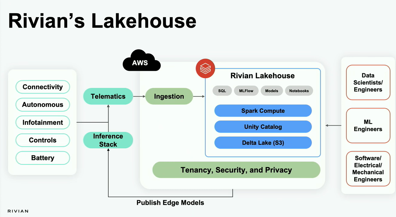 Rivian used Databricks and its Lakehouse platform to build a new architecture on top of data lakes that could scale. Bensaid said Rivian also uses Databricks Unity Catalog to create one version of the truth.