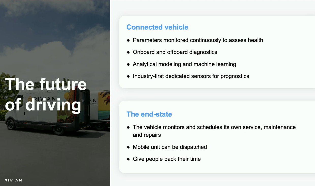Ultimately, Rivian is planning to improve the customer experience and become more predictive about maintenance and improving performance. "Imagine a world where a vehicle will self-monitor its health and schedule its own appointments to deliver an amazing experience."