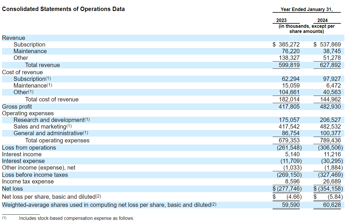 Rubrik is paying heavily to acquire customers and its go-to-market operations. For fiscal 2024, Rubrik delivered a net loss of $354.2 million on revenue of $627.9 million, up from $599.82 million in fiscal 2023. Rubrik spent $482.53 million on sales and marketing in fiscal 2024. In fiscal 2023 and fiscal 2024, operating cash flow was $19.3 million and $(4.5) million, respectively, and free cash flow was $(15.0) million and $(24.5) million, respectively.
