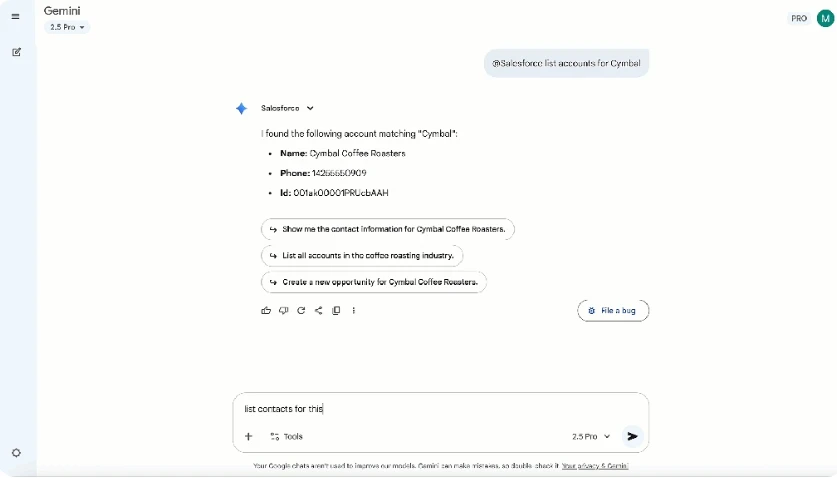 - Salesforce customers can access and view data and insights across the Gemini app and Workplace tools such as Sheets, Docs, Drive and Meet.