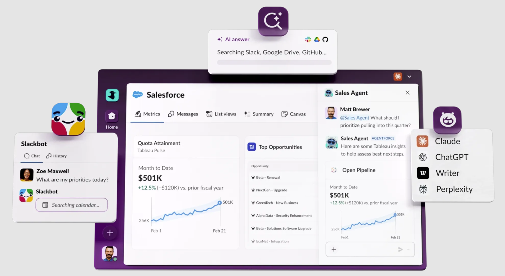 "Slack is not only becoming the front-end of Salesforce and Work 360, but it's becoming your agentic OS where you can search, collaborate and act across all the people in your organization, data and connect with agents," said Parker. "We're reimagining Salesforce and Slack. Maybe you don't log in to Salesforce or even see it, but it's there. It's coming to you in Slack because that's where you're getting your work done with native AI and enterprise AI search. Then you can unify your entire enterprise in one agentic OS and bring in other AI agents."