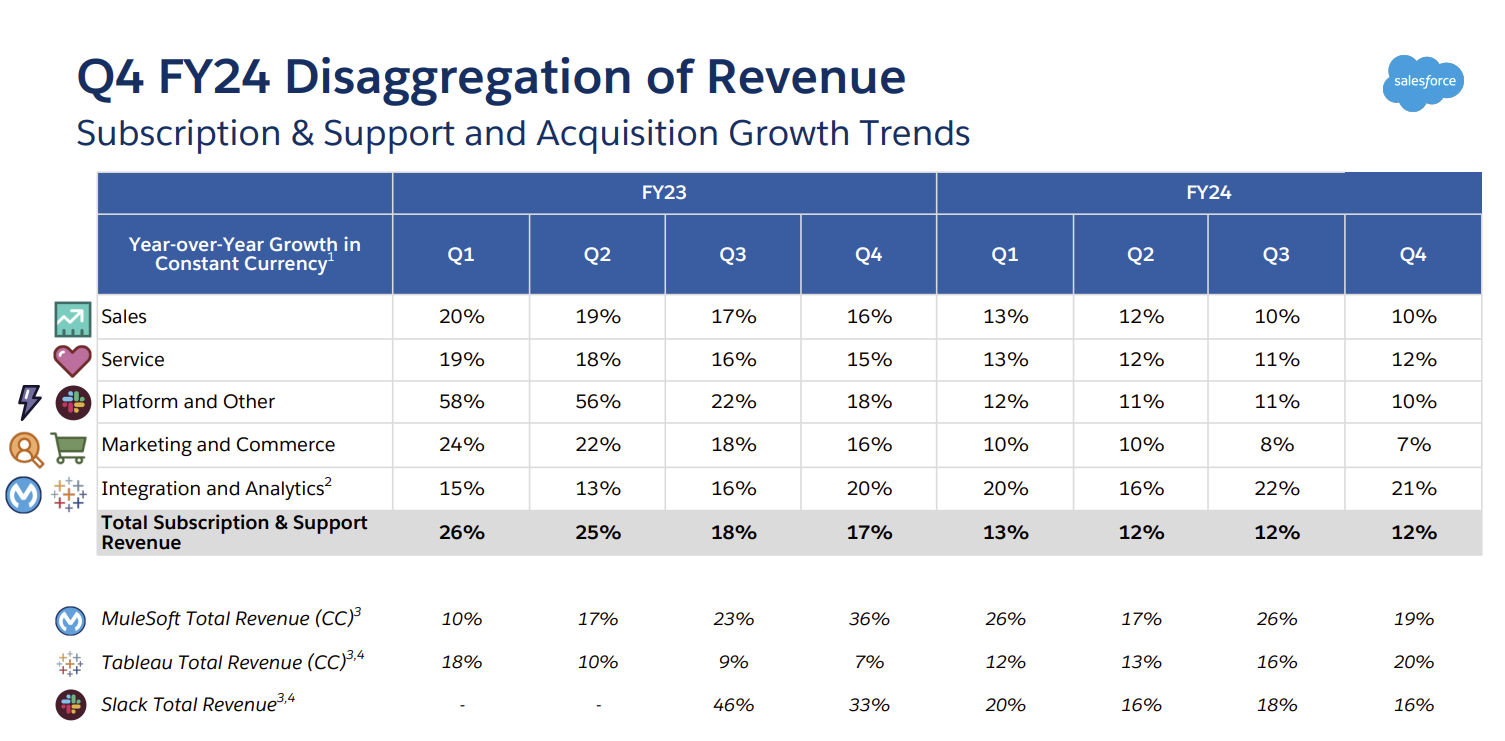 CFO Amy Weaver said the company saw a strong close to the fiscal year. In the fourth quarter, Salesforce's integration and analytics products (MuleSoft and Tableau) posted the strongest revenue growth of 21%. Marketing and Commerce Cloud had growth of 7% with Sales, Service and Platform posting revenue growth of 10% to 12%.
