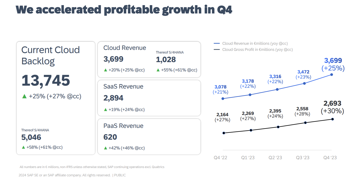 SAP said fourth quarter revenue was €8.47 billion with cloud revenue of €3.7 billion. SAP S/4HANA cloud revenue was €1.03 billion. Earnings per share were €1.01 a share. Adjusted earnings were €1.41.