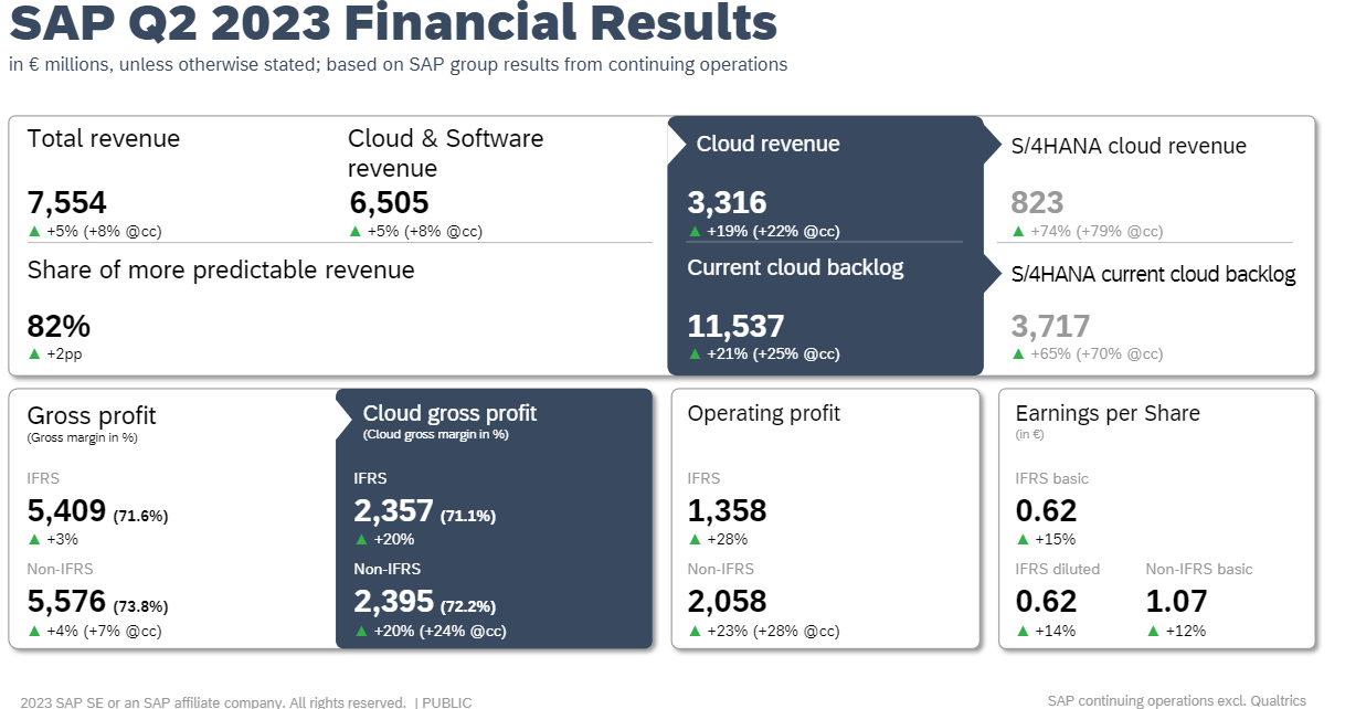 The company posted earnings of â¬0.62 on revenue of â¬7.55 billion. SAP also narrowed its outlook with â¬14 billion to â¬14.2 billion for 2023, down from â¬14 billion to â¬14.4 billion. SAP's cloud revenue was up 19% in the second quarter.