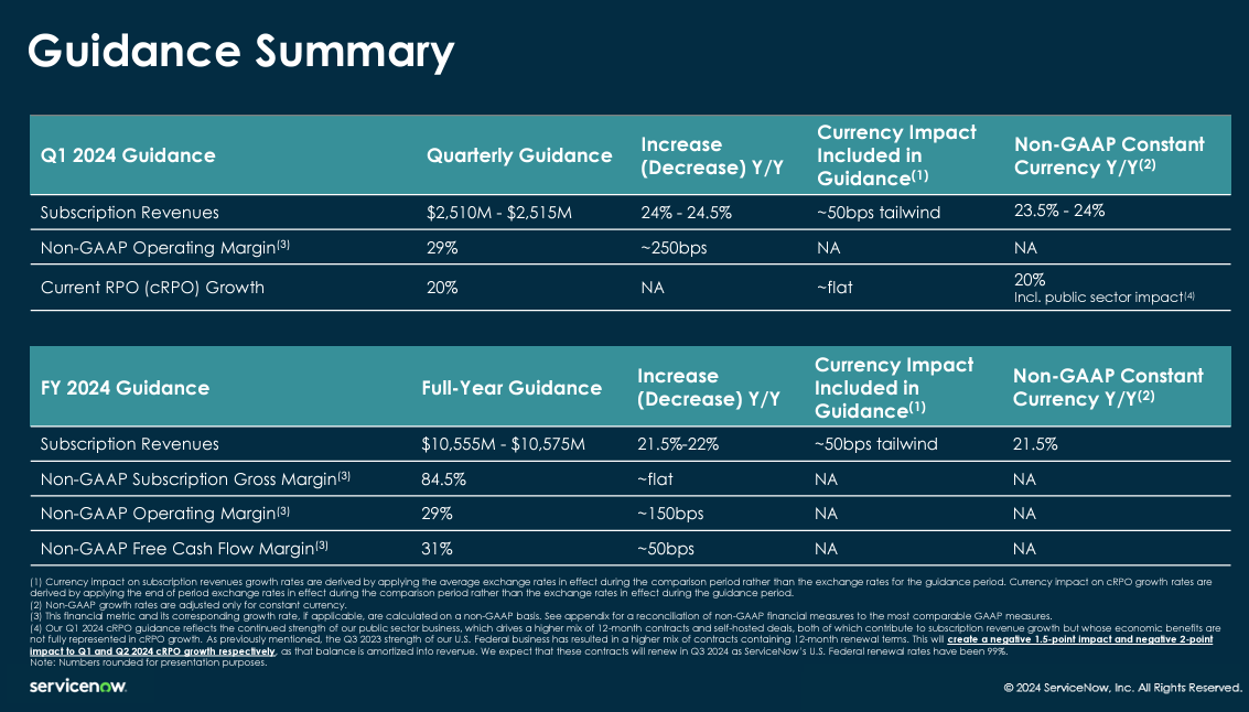 As for the outlook, ServiceNow projected first quarter subscription revenue growth of 24% to 24.5% with non-GAAP margins of 29%. Here's the full outlook.