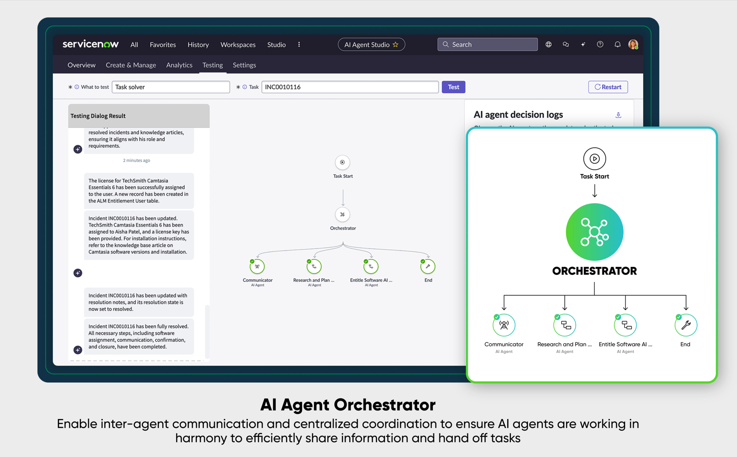 ServiceNow AI Agent Orchestrator. The company said AI Agent Orchestrator is designed to enable inter-agent communication and centralized coordination. The focus is on ensuring AI agents can share information and hand off tasks at multiple parts of the process. AI Agent Orchestrator can manage custom AI agents.