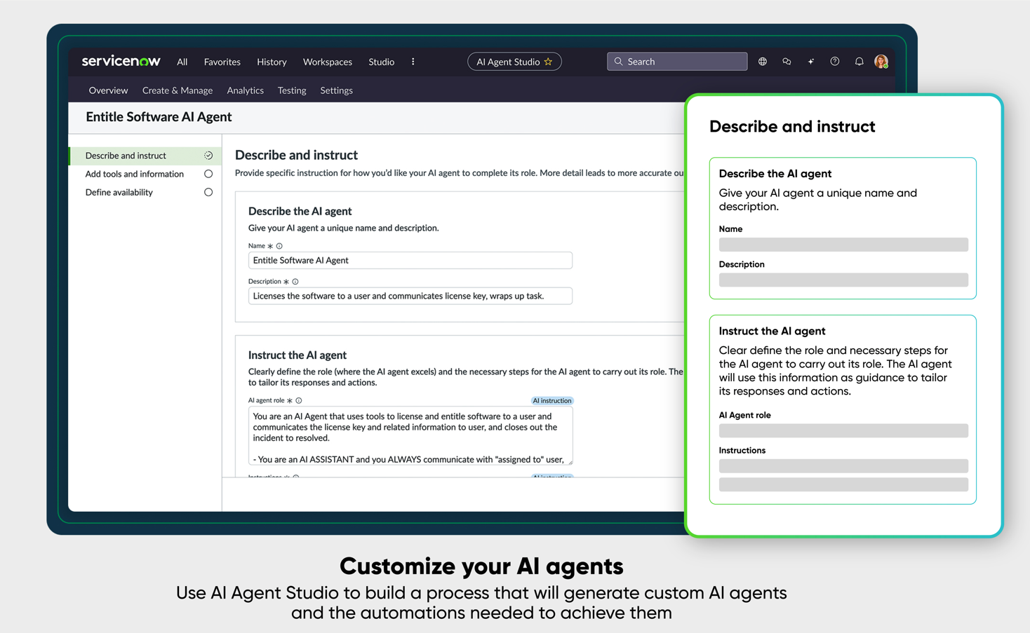 AI Agent Studio. ServiceNow said AI Agent Studio can help enterprises create and deploy custom AI agents that are integrated with workflows and the Now Platform. Teams built by AI Agent Studio can be managed by AI Agent Orchestrator.