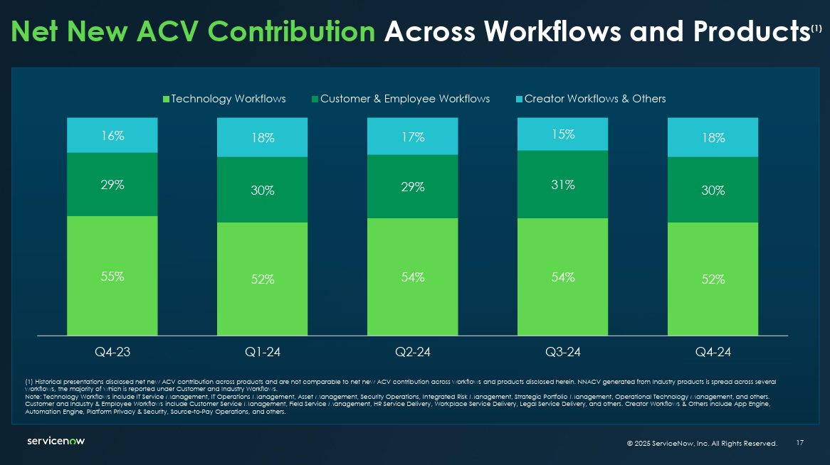 In addition, ServiceNow said it will pivot to more of a consumption based model, which usually requires a transition period and revenue disruption. ServiceNow projected 2025 revenue between $12.63 billion to $12.67 billion, up 18.5% to 19%. Non-GAAP revenue growth for 2025 will be 19.5% to 20%.