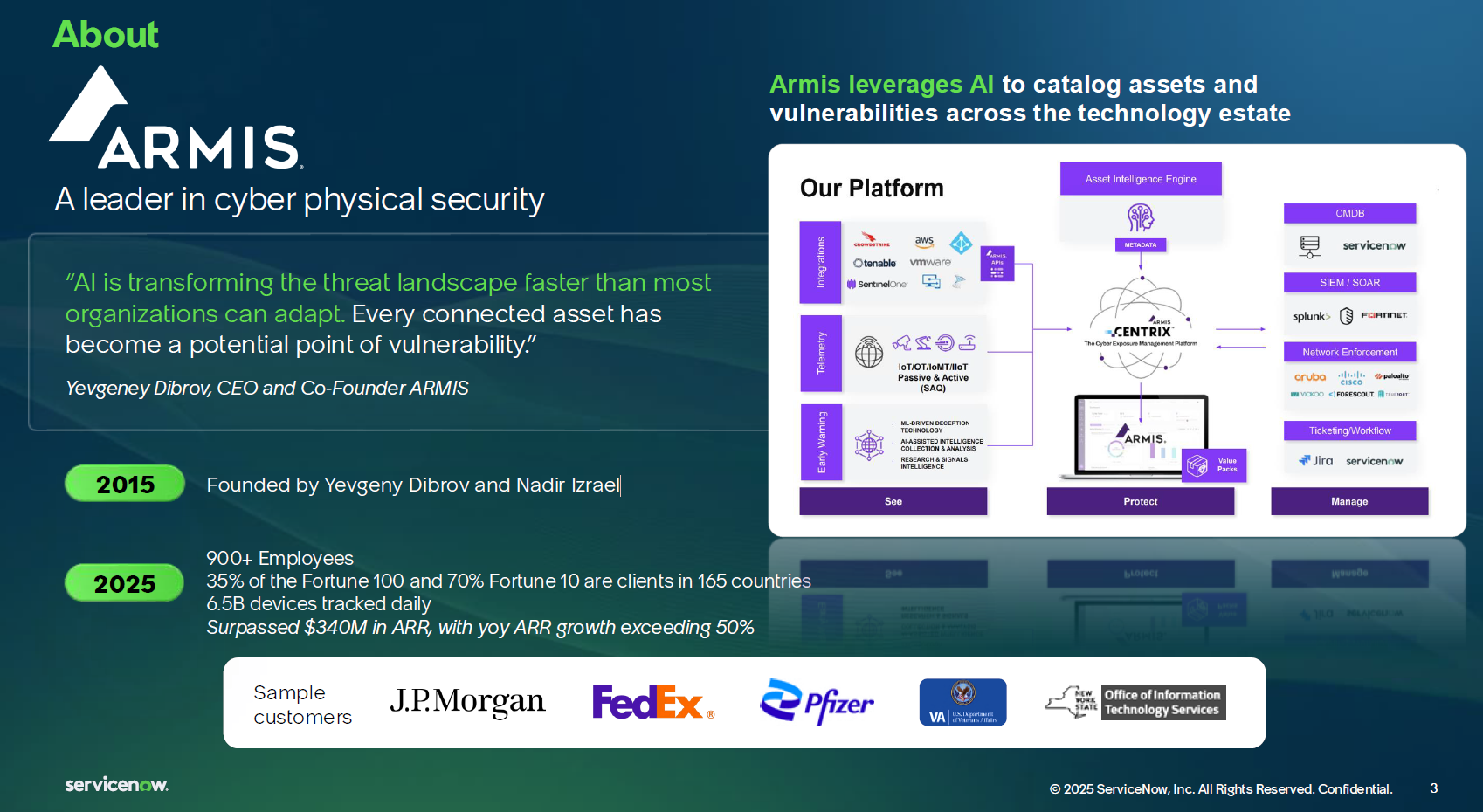 ServiceNow had already established itself as a strong orchestration layer for security, risk, and IT operations, supported by CMDB and AI-driven workflows. However, it depended heavily on external tools for asset discovery and exposure data, especially for unmanaged, non-IT, and cyber-physical environments. This created a structural gap: ServiceNow could route and govern work, but it did not natively âseeâ the full attack surface with sufficient fidelity or timeliness to support autonomous decision-making. Armis brings precisely what ServiceNow lacked: real-time, agentless discovery and classification across IT, OT, IoT, and medical devices, combined with deep exposure analytics. Its strong adoption across Fortune 100 enterprises and public-sector organizations demonstrates that this capability is already trusted at scale.â