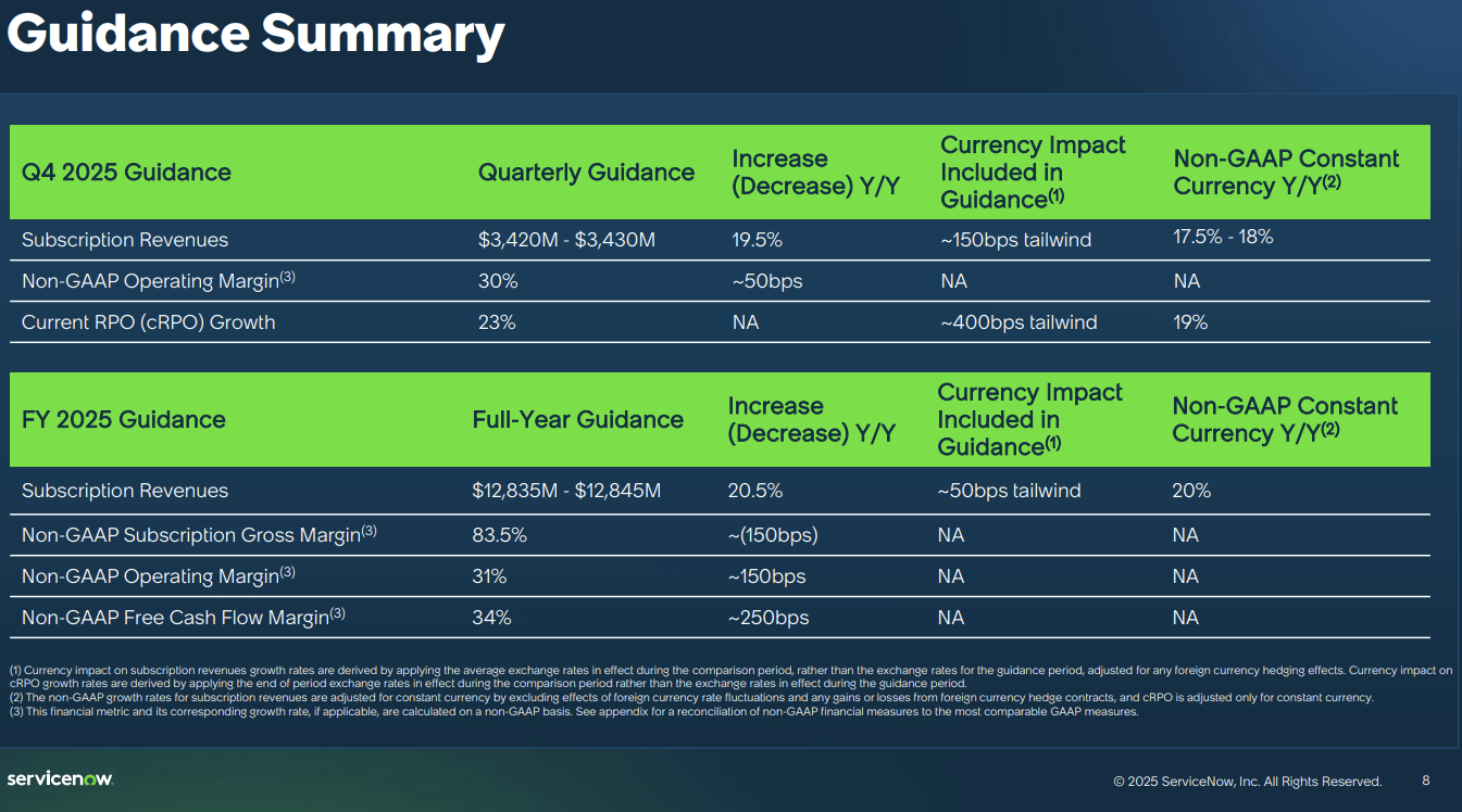 As for the outlook, ServiceNow projected fourth quarter subscription revenue of $3.42 billion to $3.43 billion, up nearly 20% from a year ago. For fiscal 2025, ServiceNow projected subscription revenue of $12.83 billion to $12.84 billion.